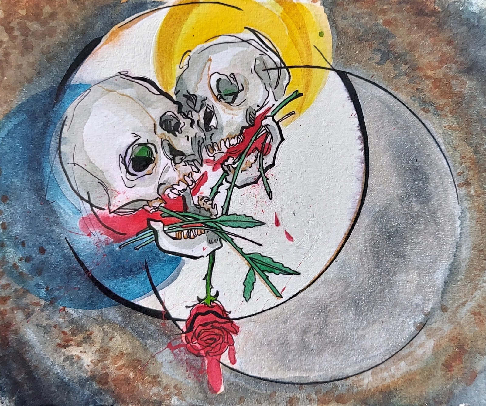 Esta pintura encarna la noción romántica del amor que trasciende incluso la muerte. En la escena, dos esqueletos se entrelazan de la mano, compartiendo una única pelvis y un par de huesos de fémur, lo que transforma a la pareja en una sola entidad.